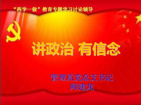 根据学院党委组织部的安排部署,管理系党总支于2016年5月11日下午3时在系会议室(慎思楼E409)开展关于“两学一做”的教育专题——“讲政治、有信念”的学习,管理系党总支所有党员参加此次会议,会议由管理系党总支书记师建龙带领大家学习相关内容。