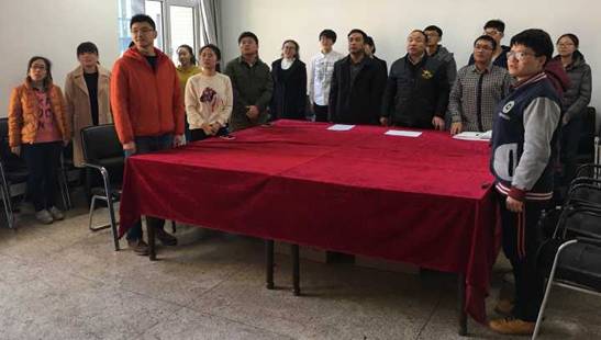 20161222日中午1300在文科楼C303会议室举行第76期预备党员入党宣誓仪式。参加这次宣誓仪式的有党总支书记师建龙同志、党总支委员系主任安祥生同志、系办公室主任曹志敏同志、学生党支部书记郭凯路同志、赵艳芳同志、10名新发展的党员及部分老党员。