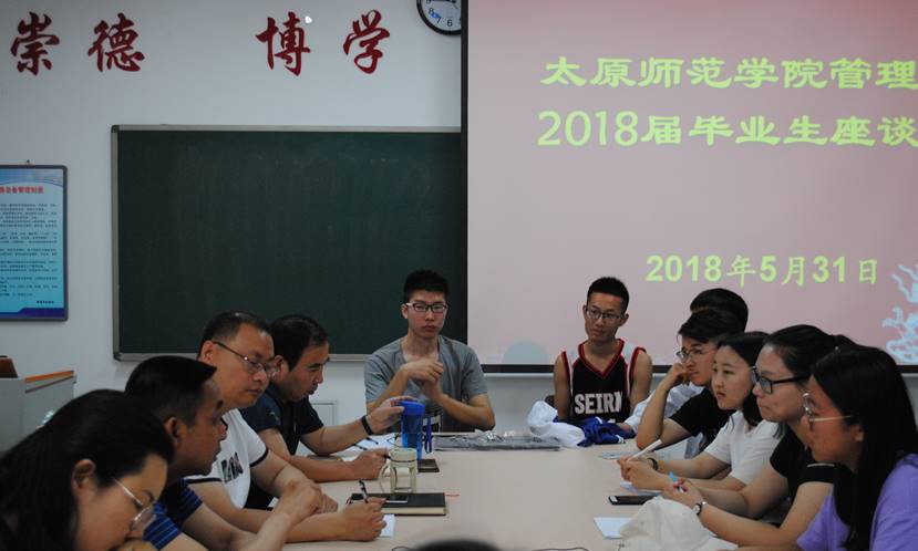 2018年5月31日上午10:30管理系2018届毕业生座谈会于汇文书院C322教室举行。党总支书记师建龙,副主任凌日平,教研室主任郝从容、教科办主任王强及实验室主任王向东及30名毕业生代表参与了此次座谈会。