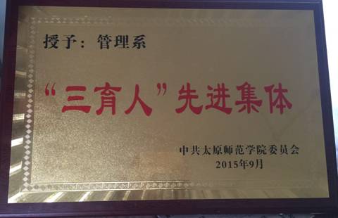9月9日上午,第31个教师节来临之际,太原师范学院在新校区陶诗园隆重举行庆祝第31个教师节表彰活动,管理系荣获太原师范学院2013-2015年度“三育人”先进集体。此次表彰,既是对管理系过去两年工作成绩的肯定,也对今后管理系的工作提出了更高的要求,大力弘扬行知精神,再接再厉,与时俱进、特色办学,勇于突破创新,推动管理系更好更快的发展。