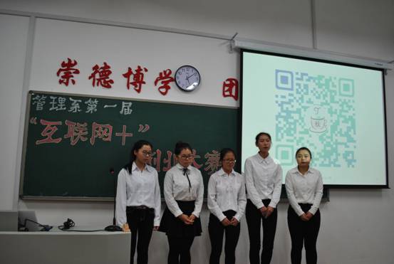 为深化管理系创新创业教育实践改革,进一步激发管理系学生创新创业的热情和能力,2016年11月22日,在前期初赛的基础上,由管理系社团联合会组织的第一届‘互联网+’创业大赛决赛在文科楼FC102隆重举行。担任比赛评委的是管理系创新创业指导老师曹志敏老师,及陈振孝老师、王洁玉老师、汪立平老师、学生会主席李俊瑶,另外,还请到了管理系党总支书记师建龙,分团委副书记郭凯路以及刘丽娜老师,李豪老师和张丽红老师作为特邀嘉宾。