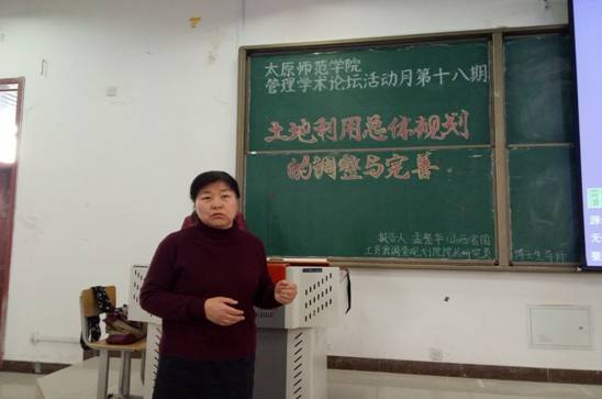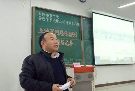 20161130日,山西省国土资源调查规划院院长、博士生导师孟繁华研究员,应管理系邀请,为我系师生作题为《土地利用总体规划的调整与完善》的专题讲座。太原师范学院研究生处处长马义娟、管理系主任安祥生及青年教师、学生共计一百五十余人聆听了此次讲座。